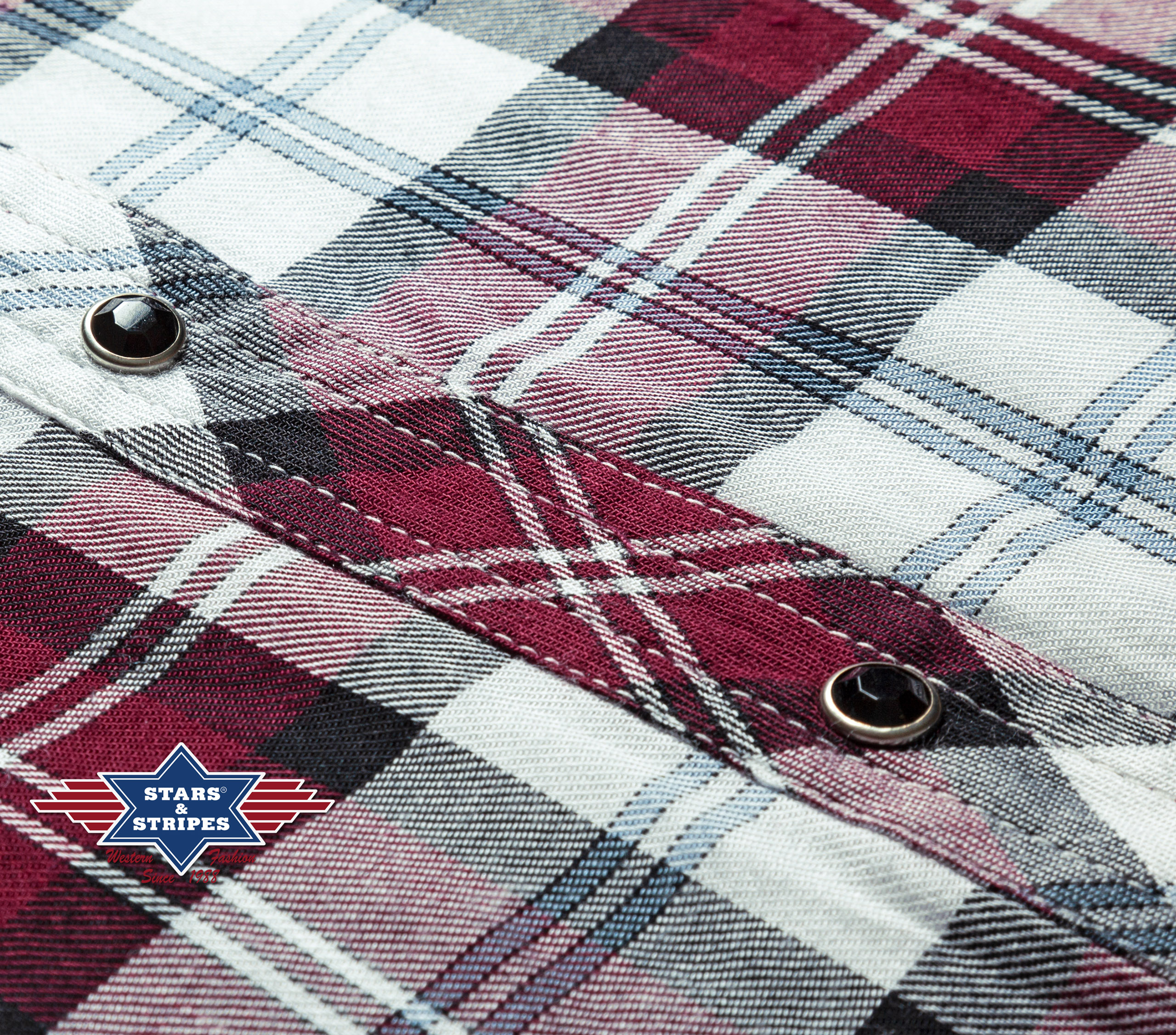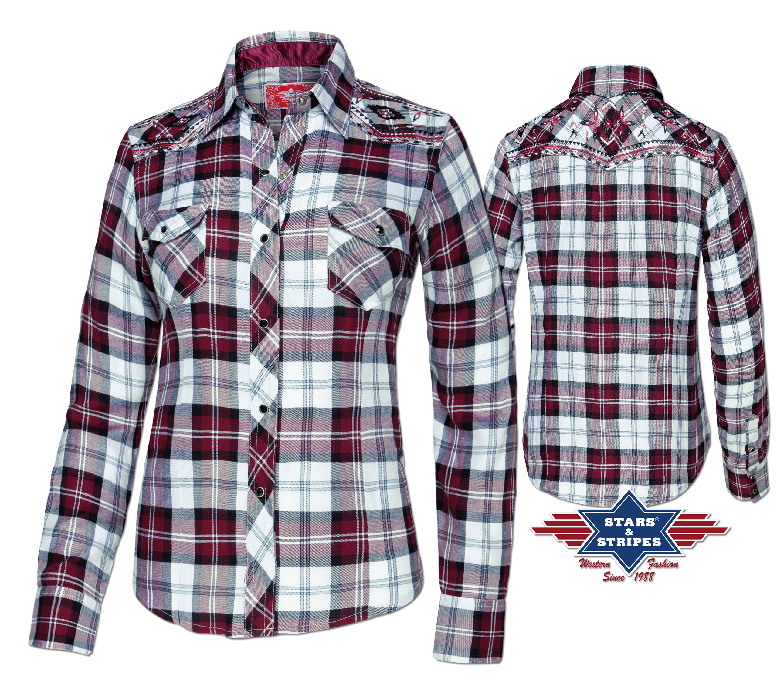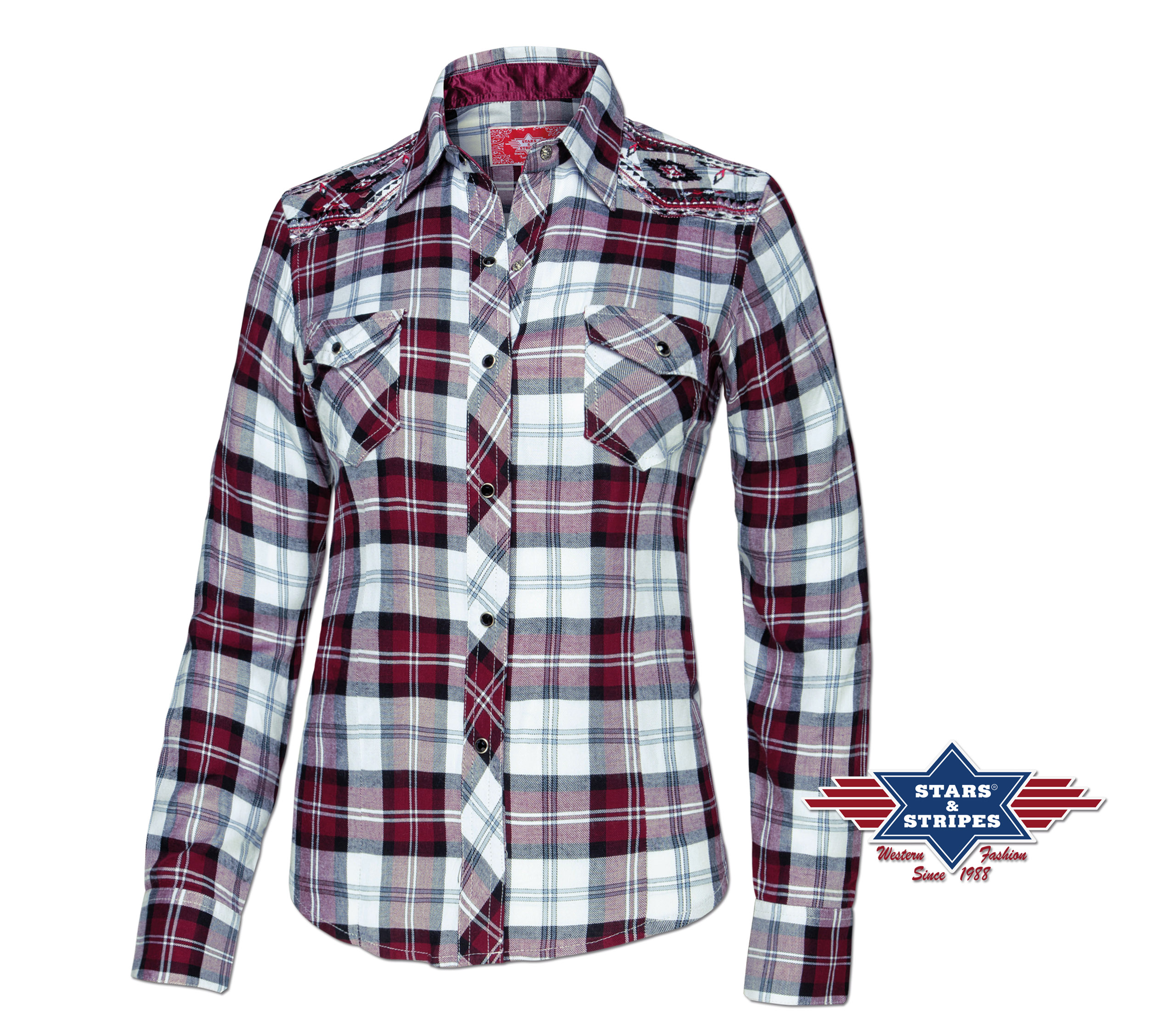 Stylová karovaná westernová dámská košile s výšivkami na ramenou. Dvě přední kapsy a zapínání na druky.