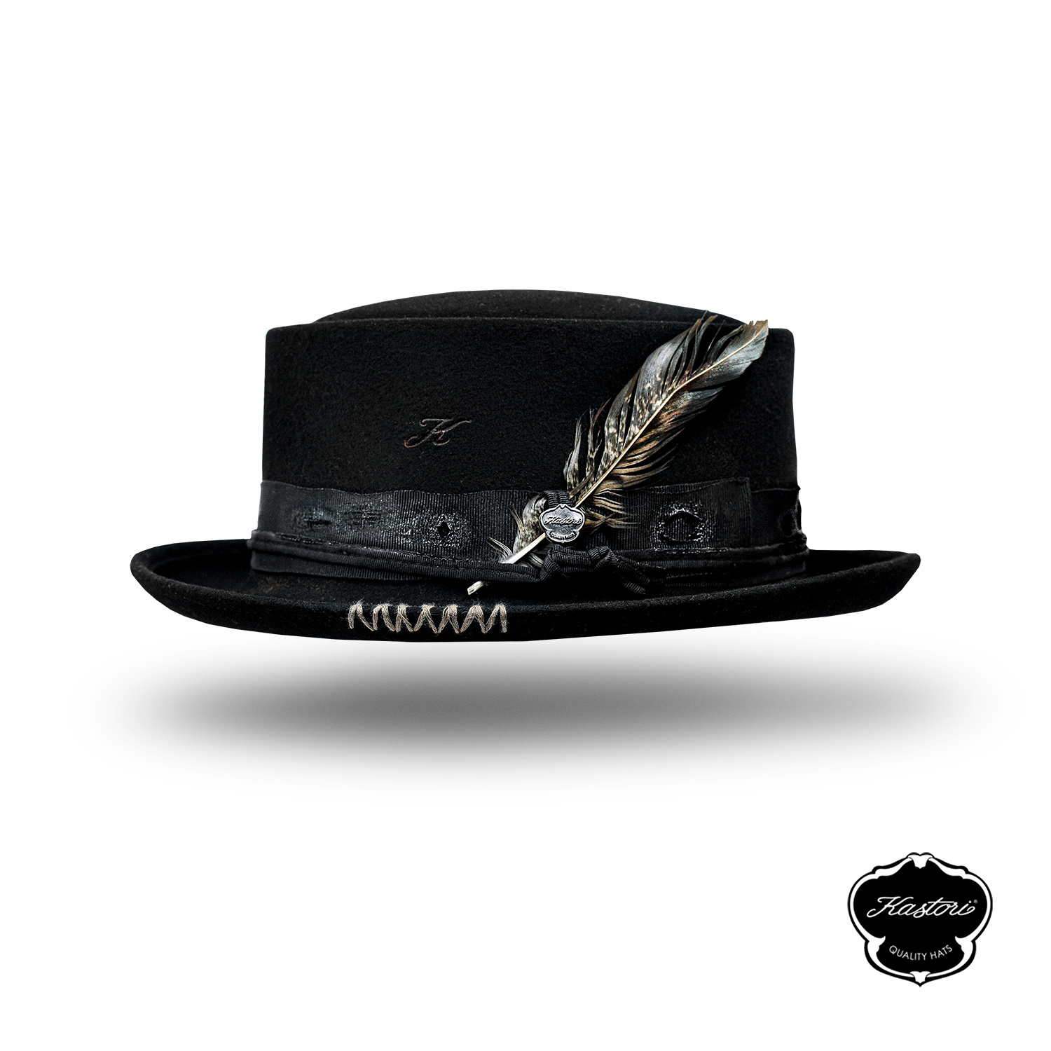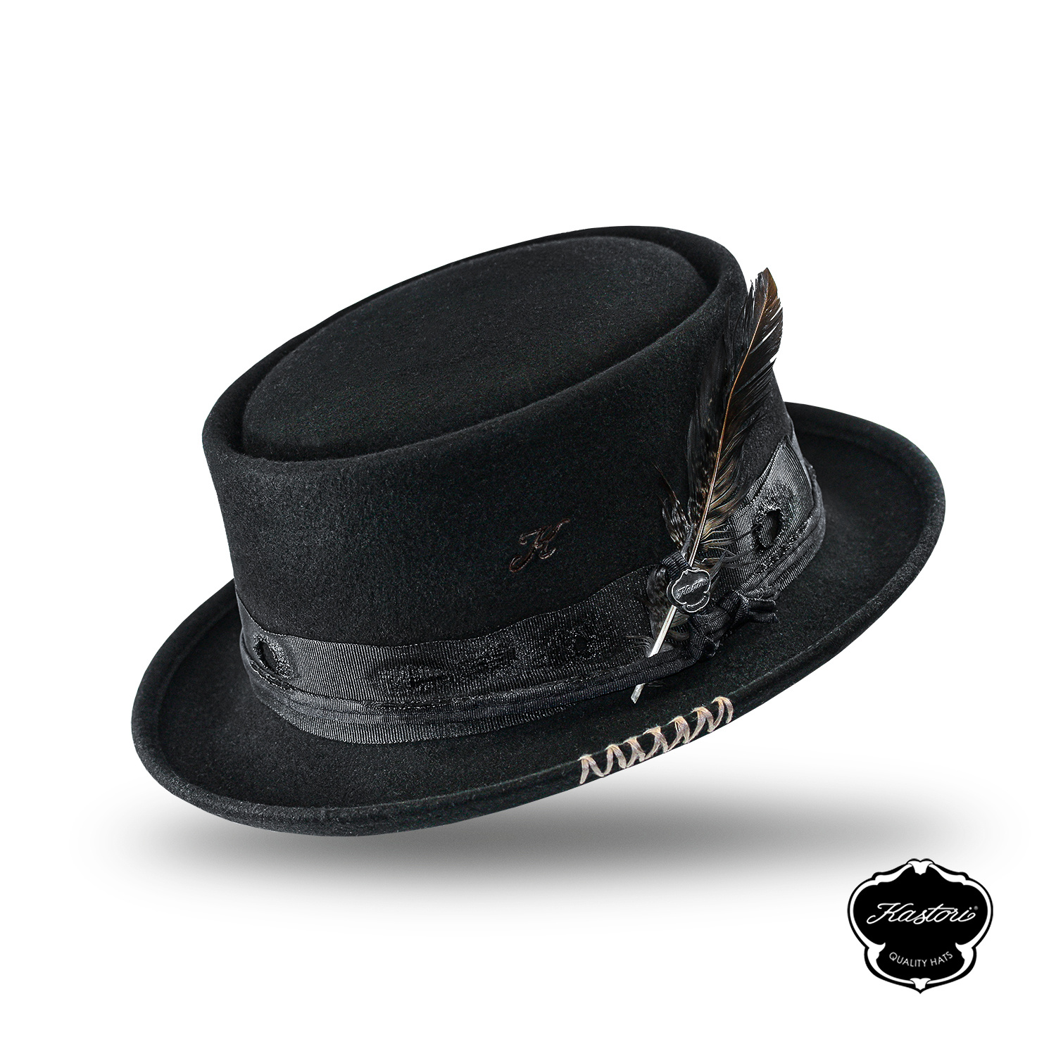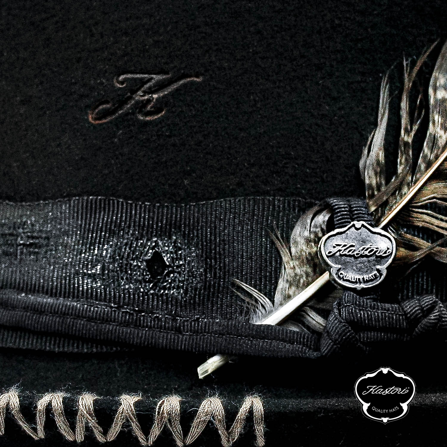 Luxusní ručně vyrobený módní klobouk z kolekce Kastori od německé firmy Stars and Stripes. Zdobení nitěmi a logem značky dotváří jedinečný vzhled.