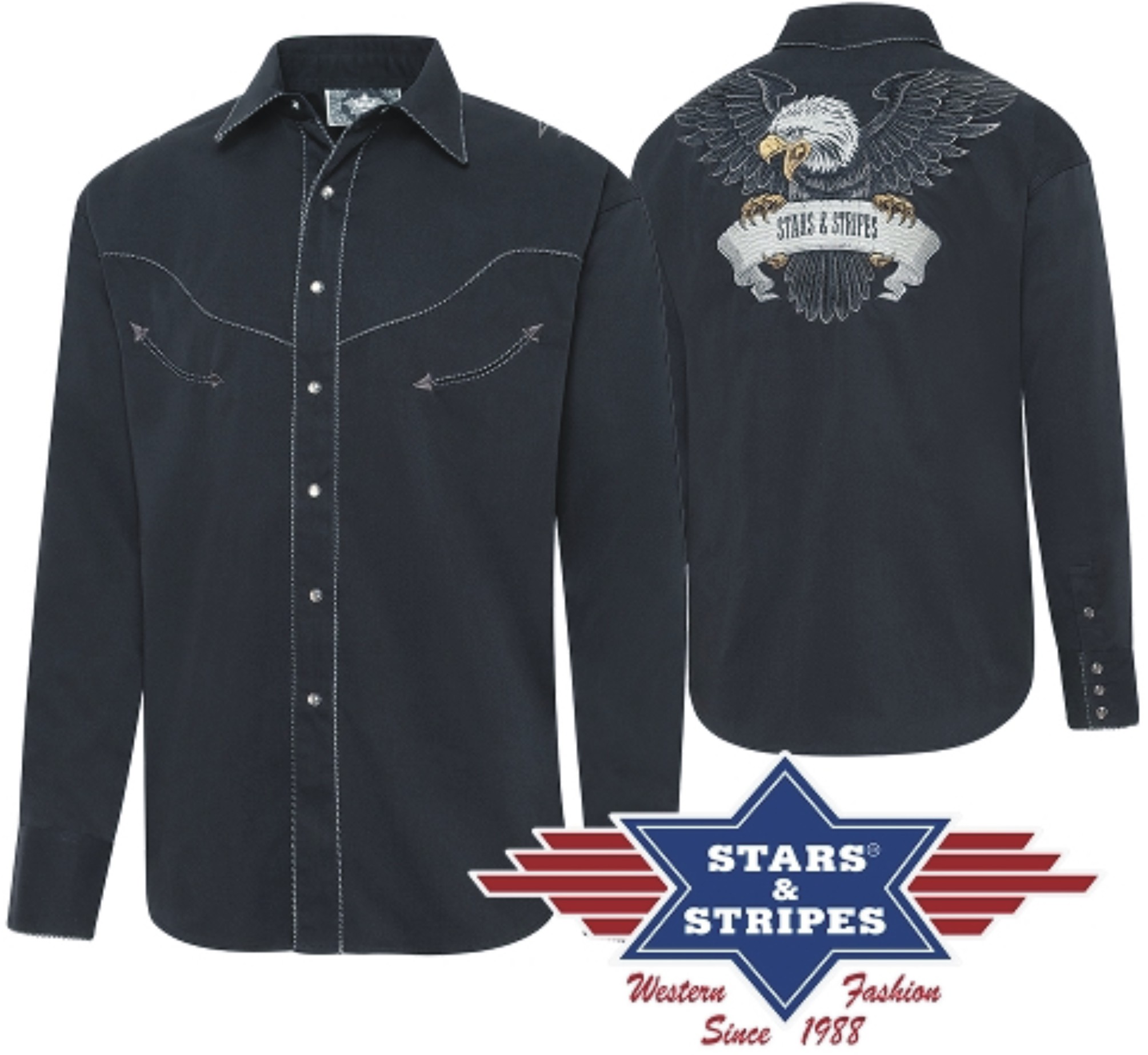 Stylová černá košile s kontrastním westernovým sedlem a náprsními kapsami. Design doplňuje lem límečku klopy, stylové druky a luxusní výšivka orla na zádech.