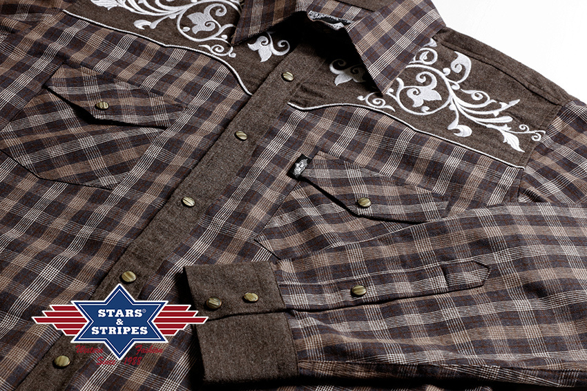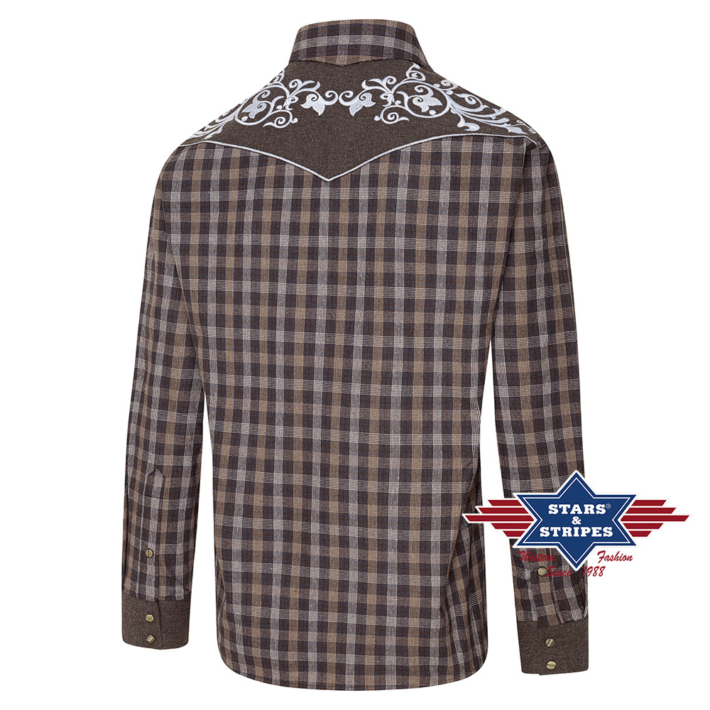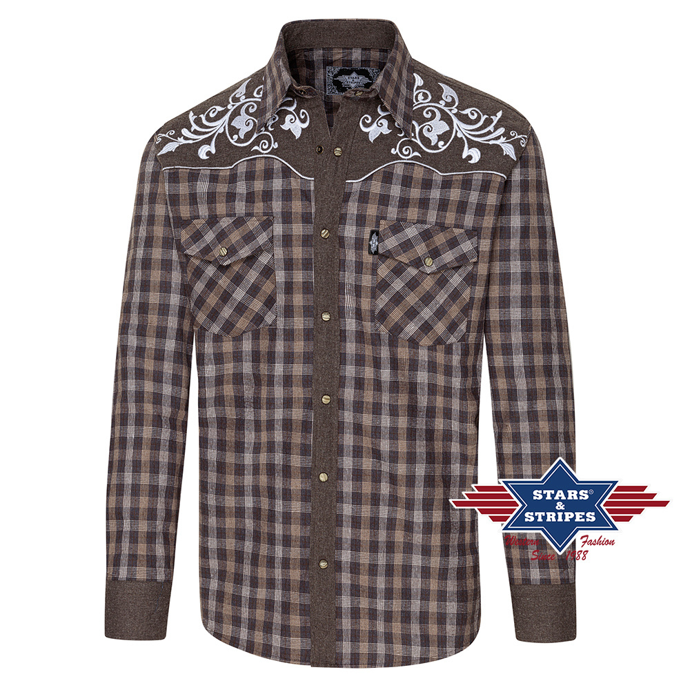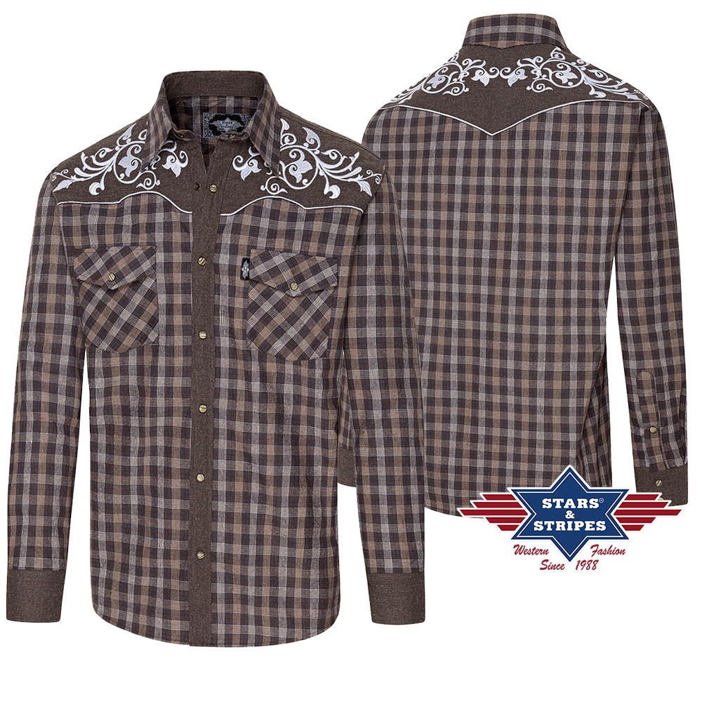 Stylová kostkovaná košile s vyšívaným westernovým sedlem květinového vzoru. Košili dotváří náprsní kapsy, lem v límci a slušivé patentky.