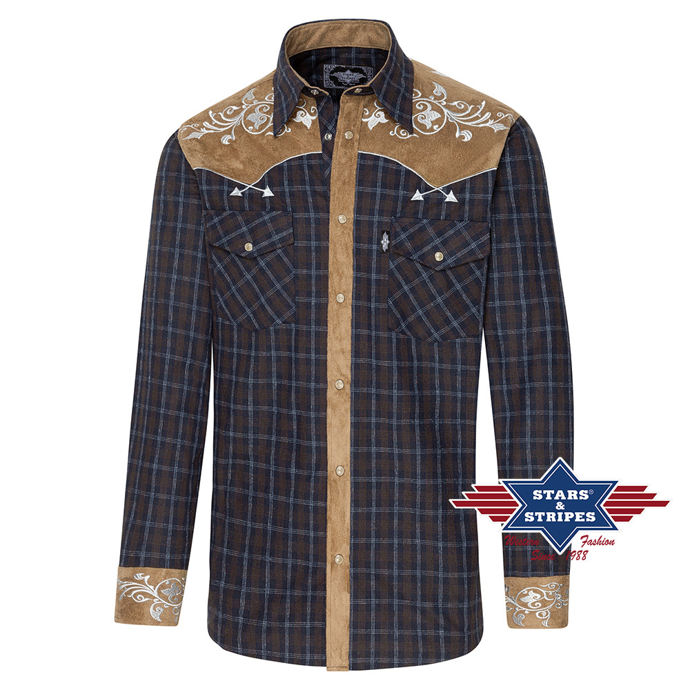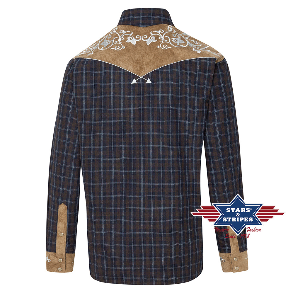 Stylová kostkovaná košile s vyšívaným westernovým sedlem květinového vzoru. Košili dotváří náprsní kapsy, lem v límci a slušivé patentky. Westernové sedlo a vyšívané manžety mají semišový vzhled.